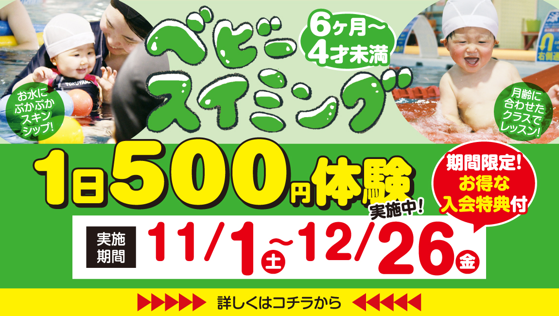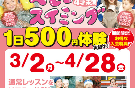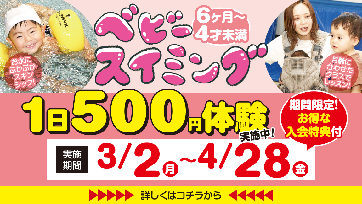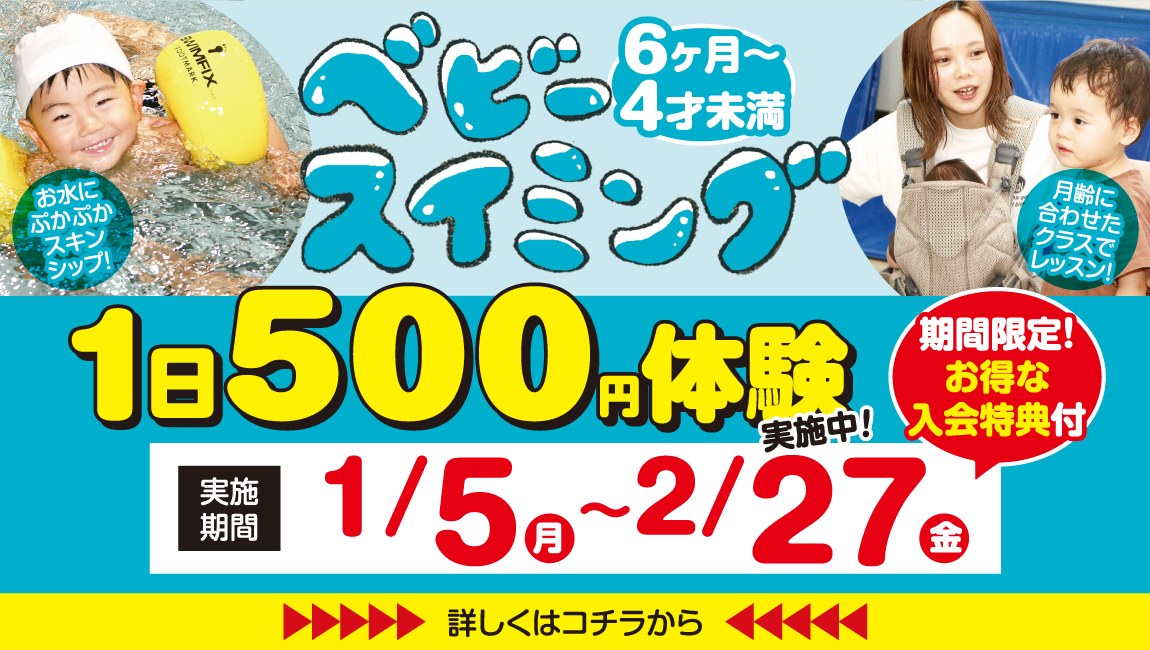 従妹がスイミングに通う姿を見て、自分から「行きたい!」と言うようになり、「お風呂で顔が濡れるのを嫌がらなくなればいいな」と思い、ベビークラスに入会しました。 …