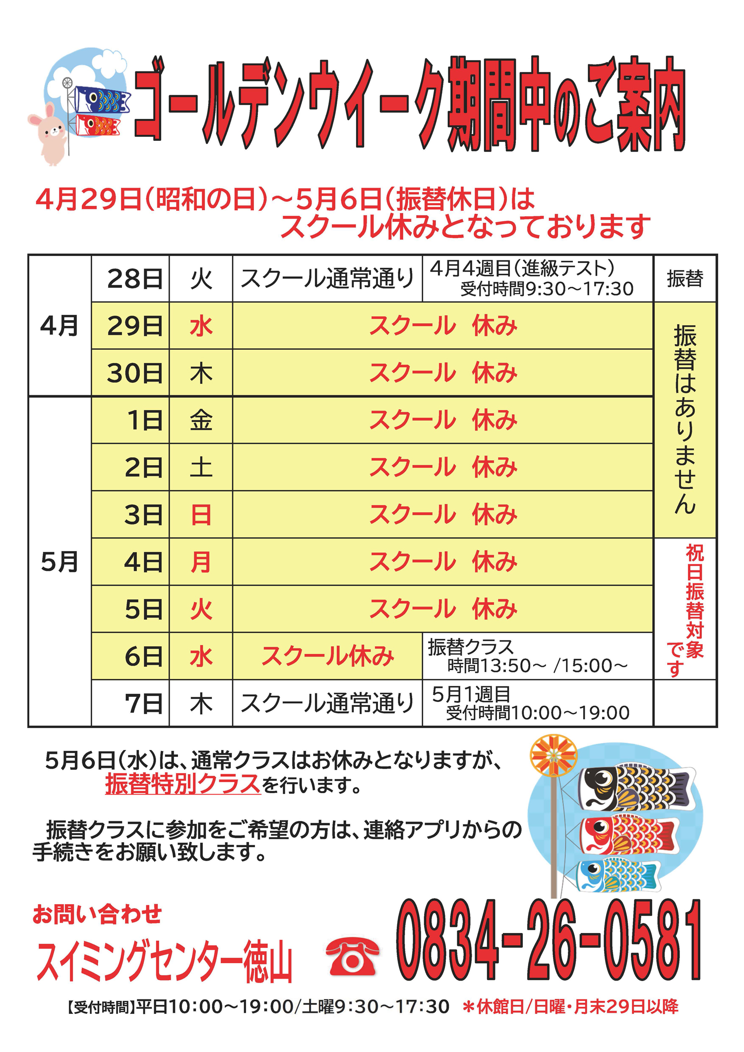 日頃より、スポーツクラブ徳山をご愛顧いただき誠にありがとうございます。 ゴールデンウィーク期間中は、下記のスケジュールにて営業いたします。 どうぞよろしくお願いいたします。
