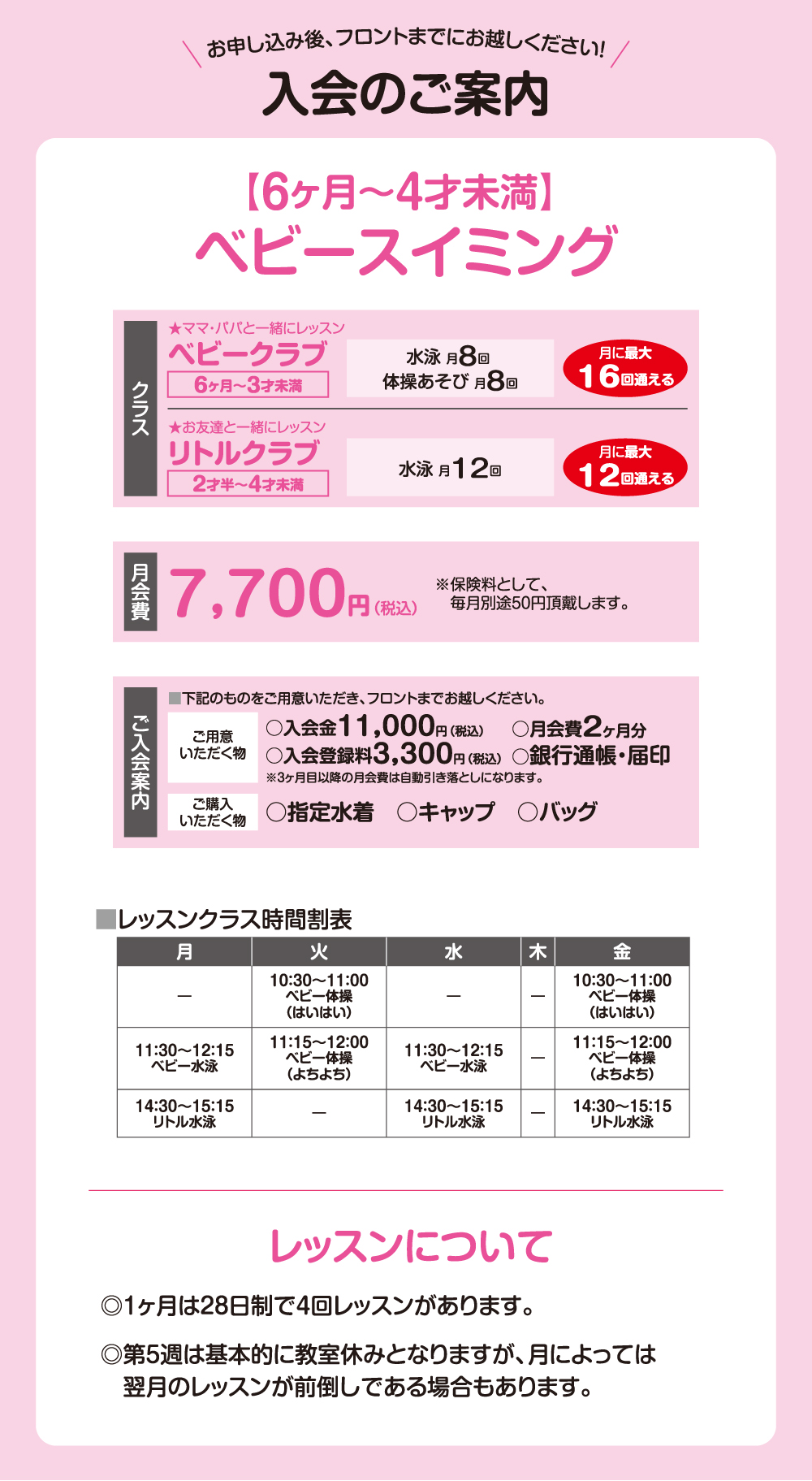 当クラブのベビースイミングは6ヶ月から入会できます。「1才になってから…」と思われる方も多いですが、赤ちゃんの頃はそれぞれの月齢によりできること、向いていることが変化します。ですから、決して早すぎるということはありません。